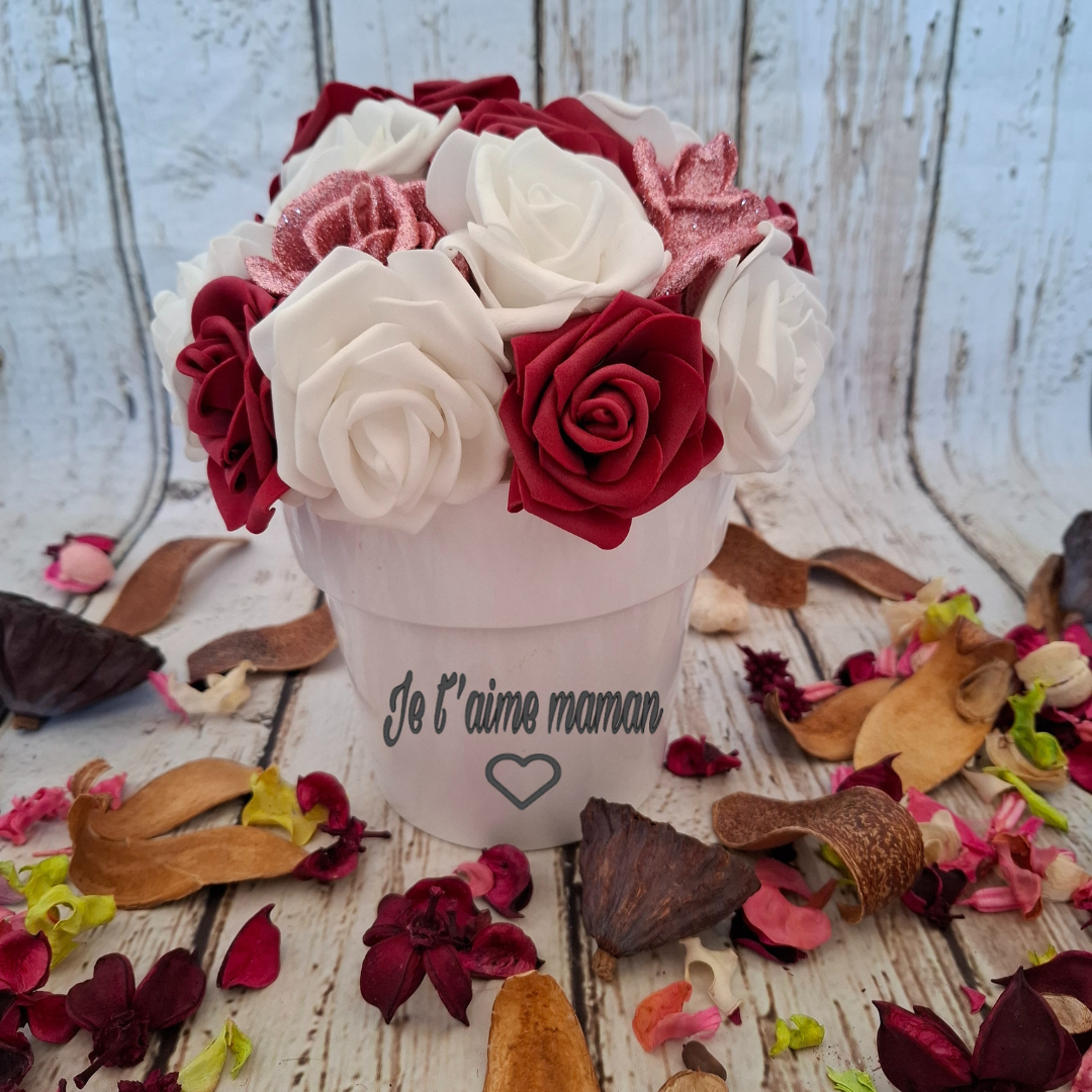 Elle comprend des roses blanches, des roses pailletées de couleur rose, ainsi que des roses de couleur rouge foncée, disposées dans un pot d’environ 15 cm de diamètre.