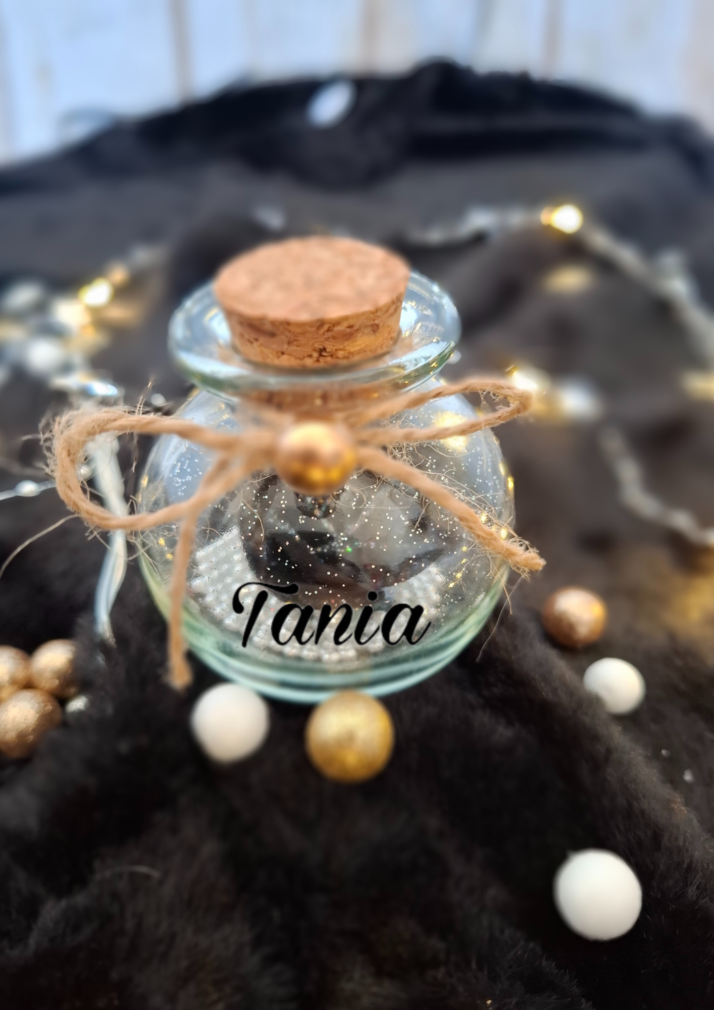 Le flacon est entouré d’une fine ficelle naturelle ornée d’une petite perle dorée, tandis que son bouchon en liège referme délicatement l’ensemble, évoquant l’univers des potions anciennes, des trésors secrets et des souvenirs protégés.