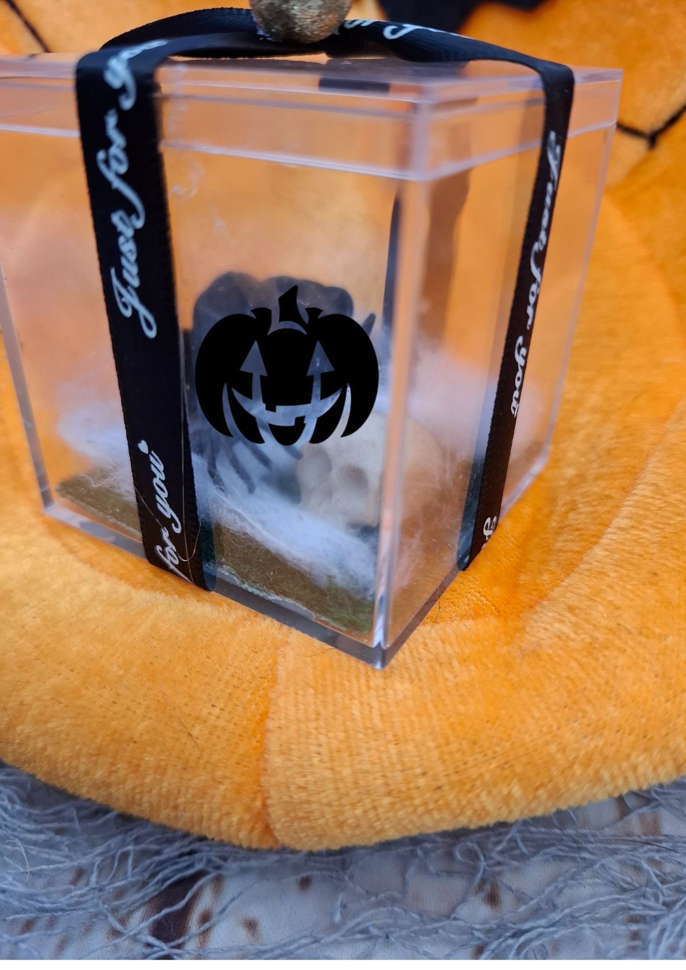 Un ruban noir entoure délicatement la boîte, tandis qu’une petite perle, soigneusement posée sur le dessus, vient parfaire l’ensemble avec une touche d’élégance sombre.